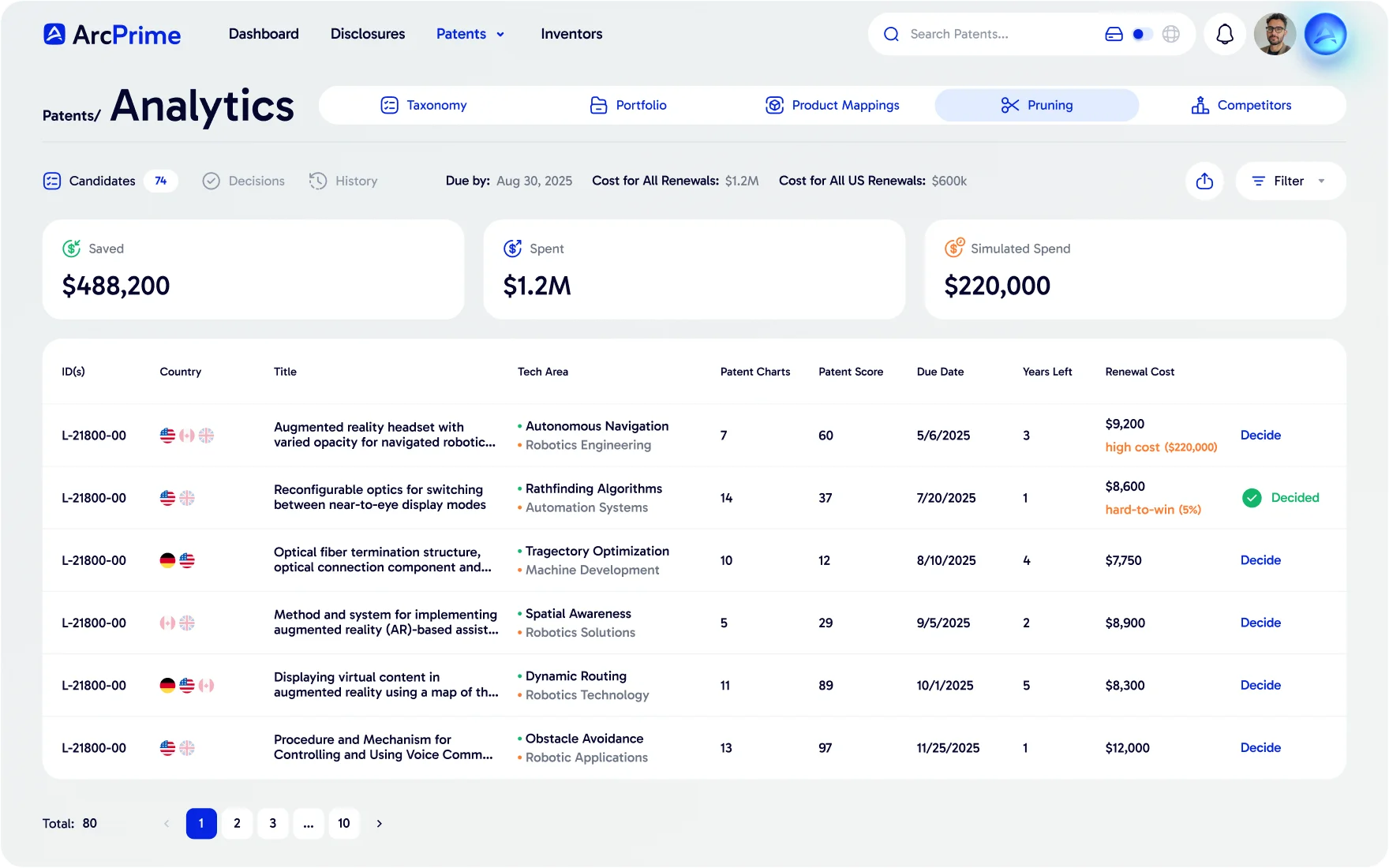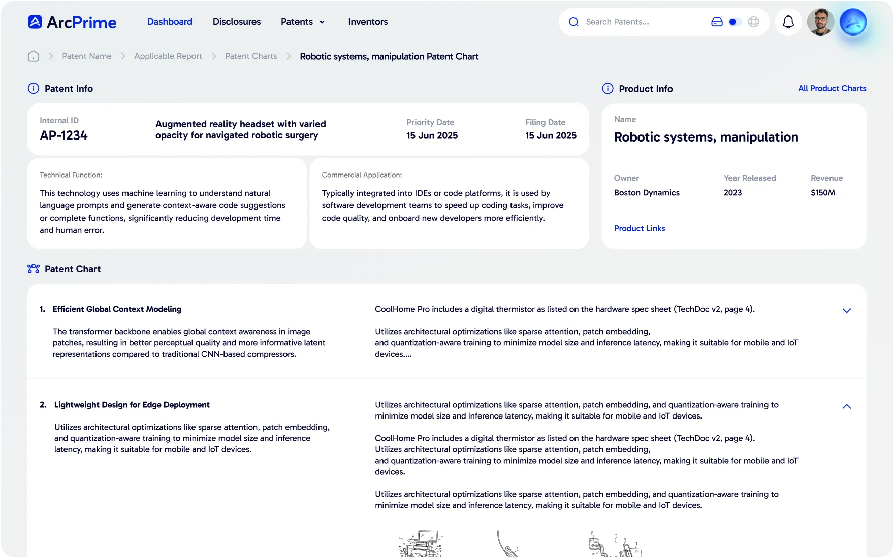 ArcPrime automates the work you never had time for — invention disclosures, prosecution, competitor charting, pruning, and budgeting.